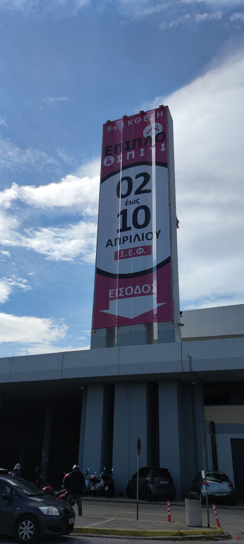 Εκτύπωση σε διάτρητο μουσαμά (δίχτυ), επεξεργγασία περιμετρικής θερμοκόλλησης με ιμάντες για ενίσχυση και τοποθέτηση στην καμινάδα του Σταδίου Ειρήνης & Φιλίας για την 9η έκθεση Έπιπλο & Σπίτι.