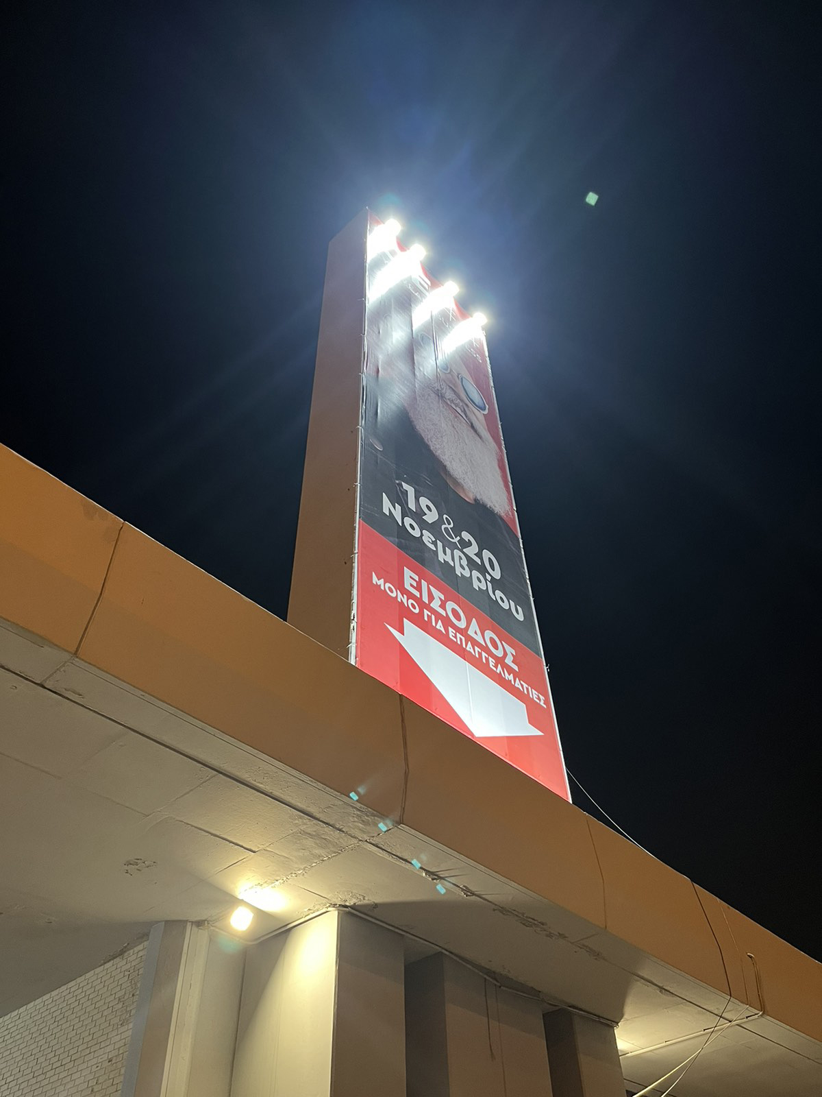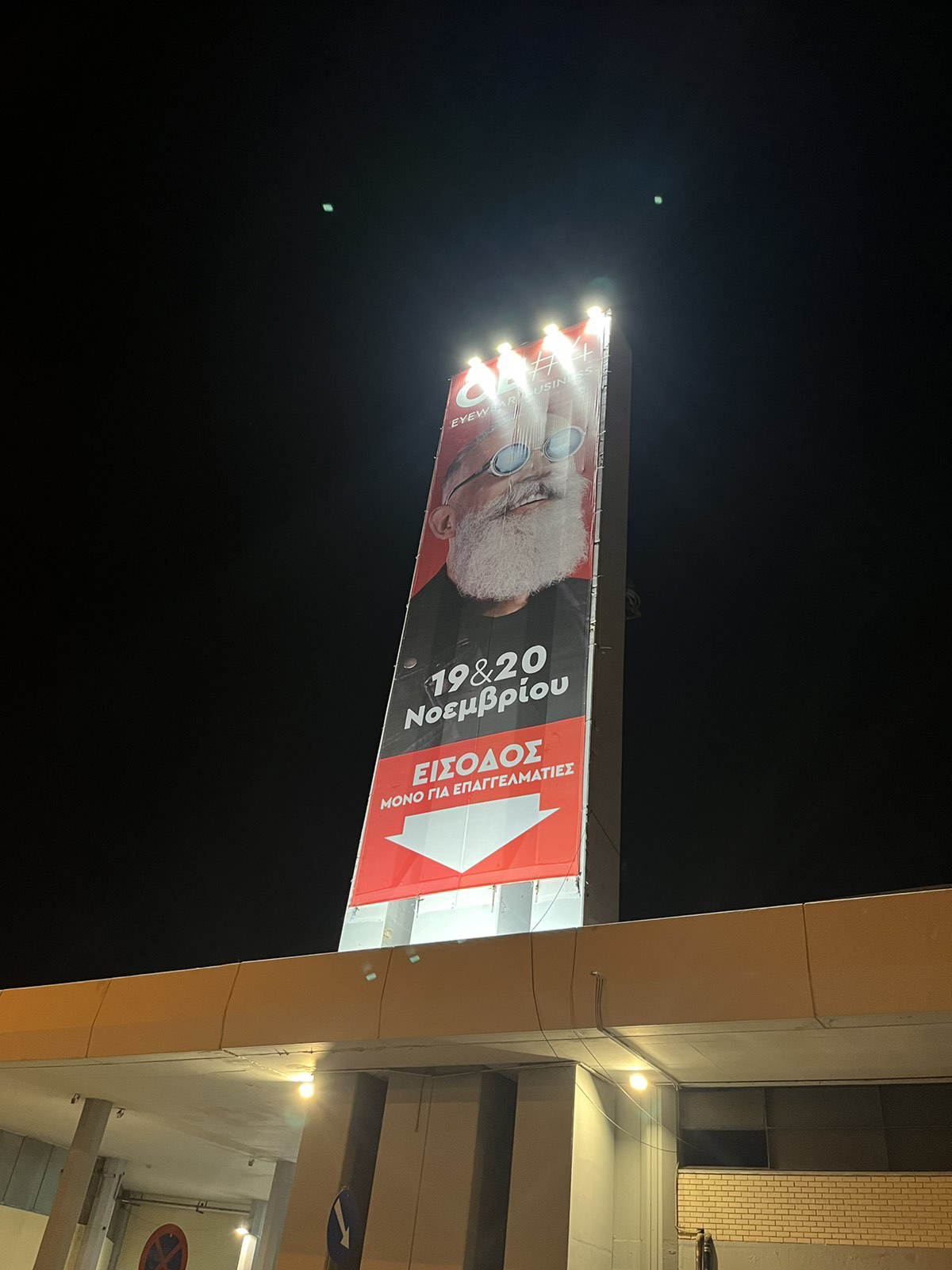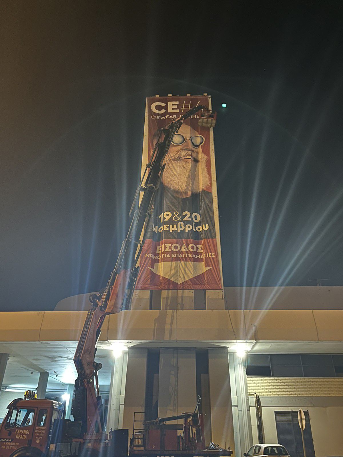 Εκτύπωση σε διάτρητο μουσαμά (δίχτυ), επεξεργγασία περιμετρικής θερμοκόλλησης με ιμάντες για ενίσχυση και τοποθέτηση στην καμινάδα του Σταδίου Ειρήνης & Φιλίας για την CE#4 EYEWEAR BUSINESS έκθεση.