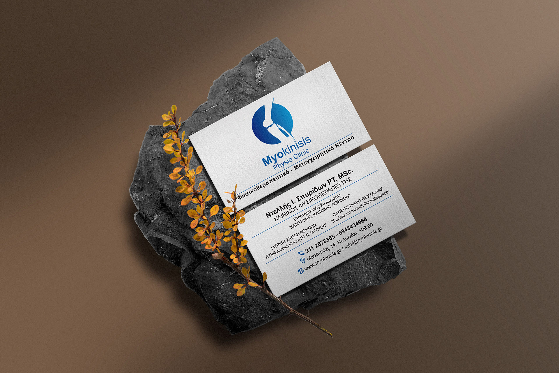 Clean minimal business card mockup on black stone with leaf background. PSD file.