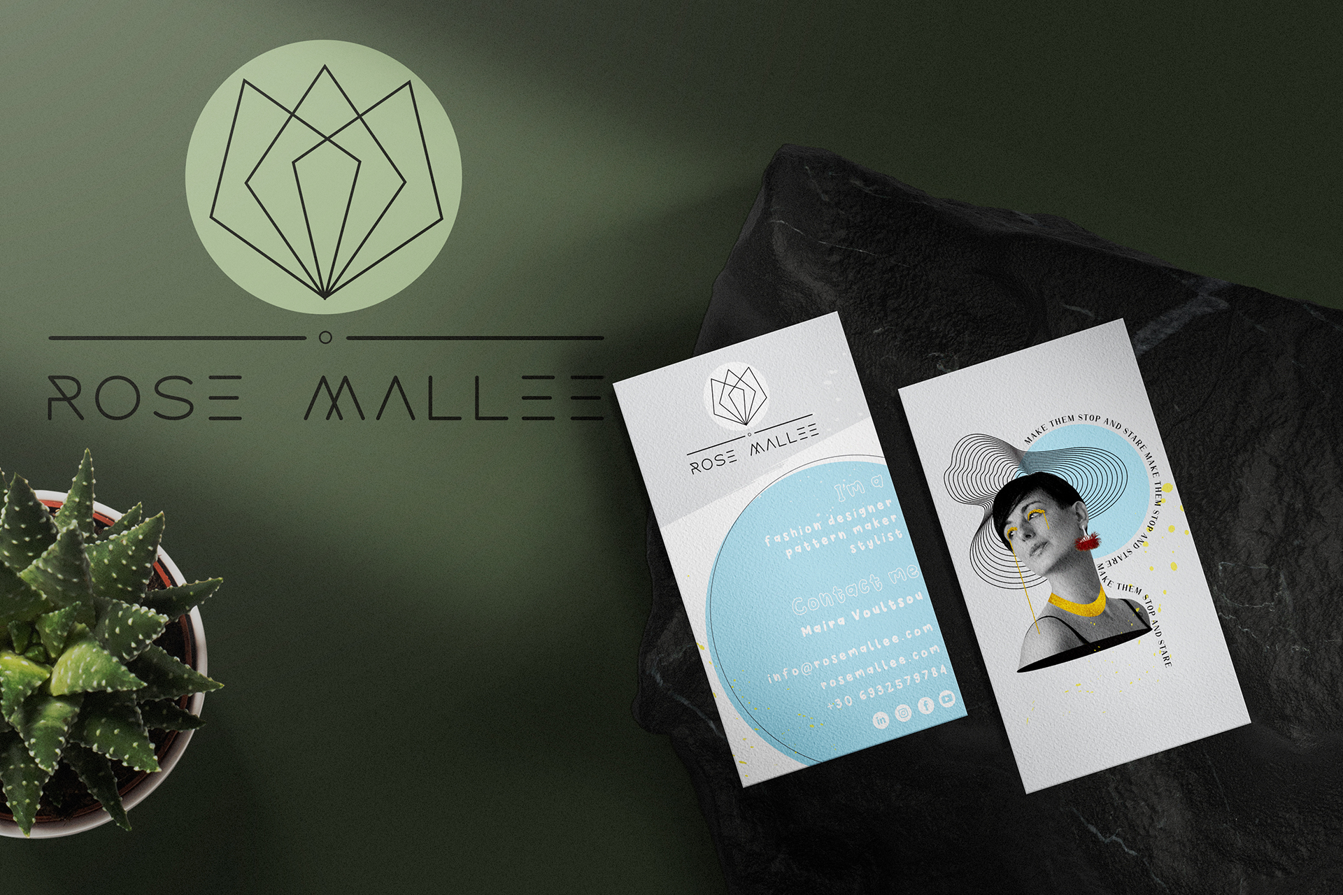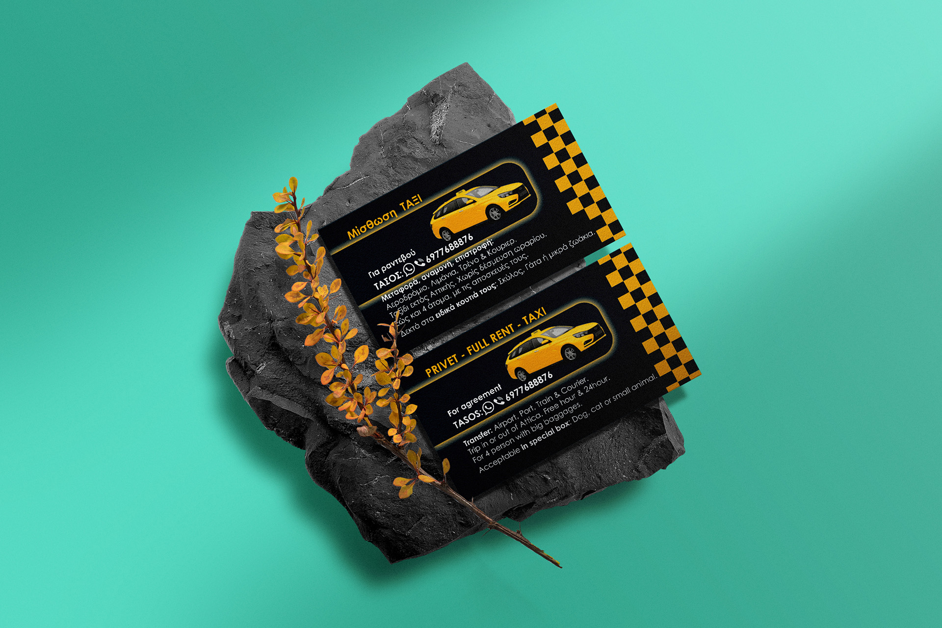 Clean minimal business card mockup on black stone with yellow plant background. PSD file.