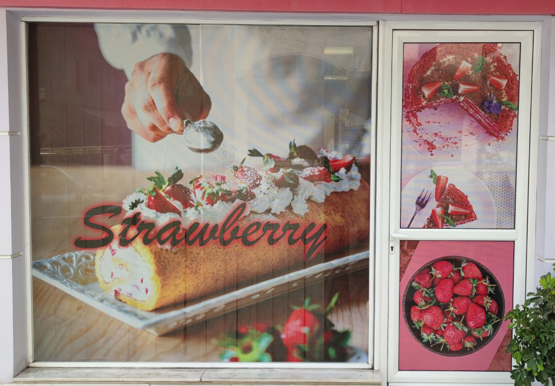 Σχεδιασμός δημιουργικού, εκτύπωση αυτοκόλλητου oneway vission και τοποθέτηση στην βιτρίνα Ζαχαροπλαστείου Strawberry Patisserie στον Άγιο Δημήτριο.